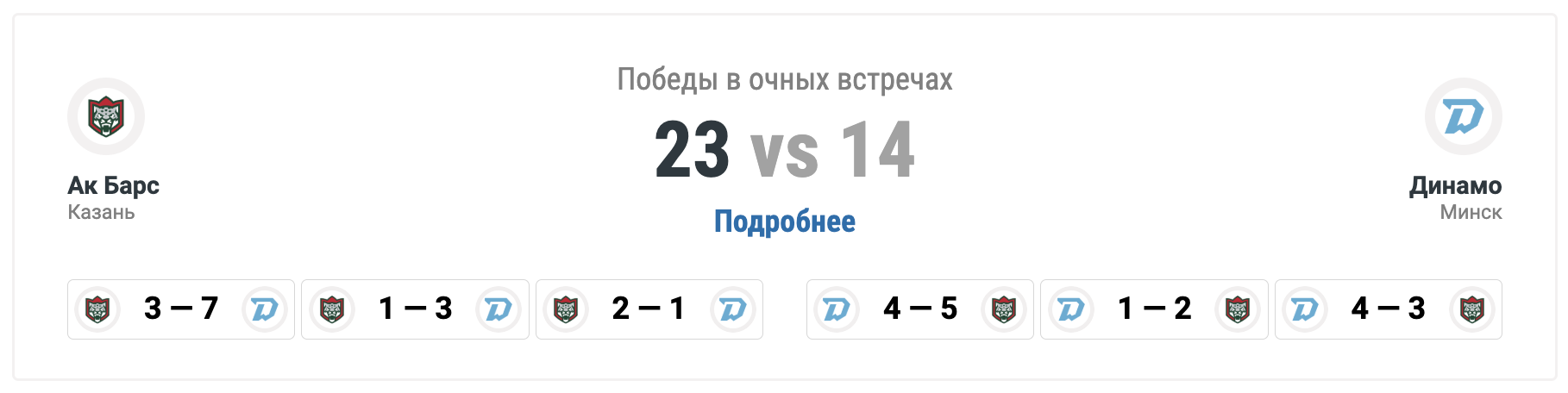 История противостояния также на стороне казанцев: "Ак Барс" выиграл 23 из 37 матчей против минского "Динамо" в КХЛ.
