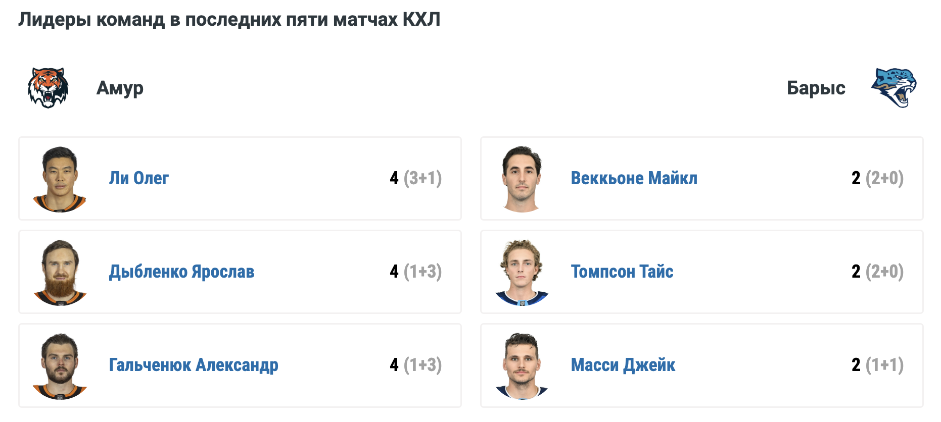 В составе "Барыса" в последних пяти играх наиболее результативны Майкл Веккьоне и Тайс Томпсон (по 2+0), а также Джейк Масси (1+1).