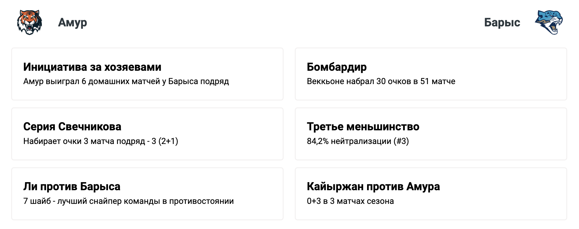 - Команды забивали меньше двух голов в первом периоде в 9 матчах подряд с участием "Барыса" и в 9 домашних матчах "Амура" из последних 10.