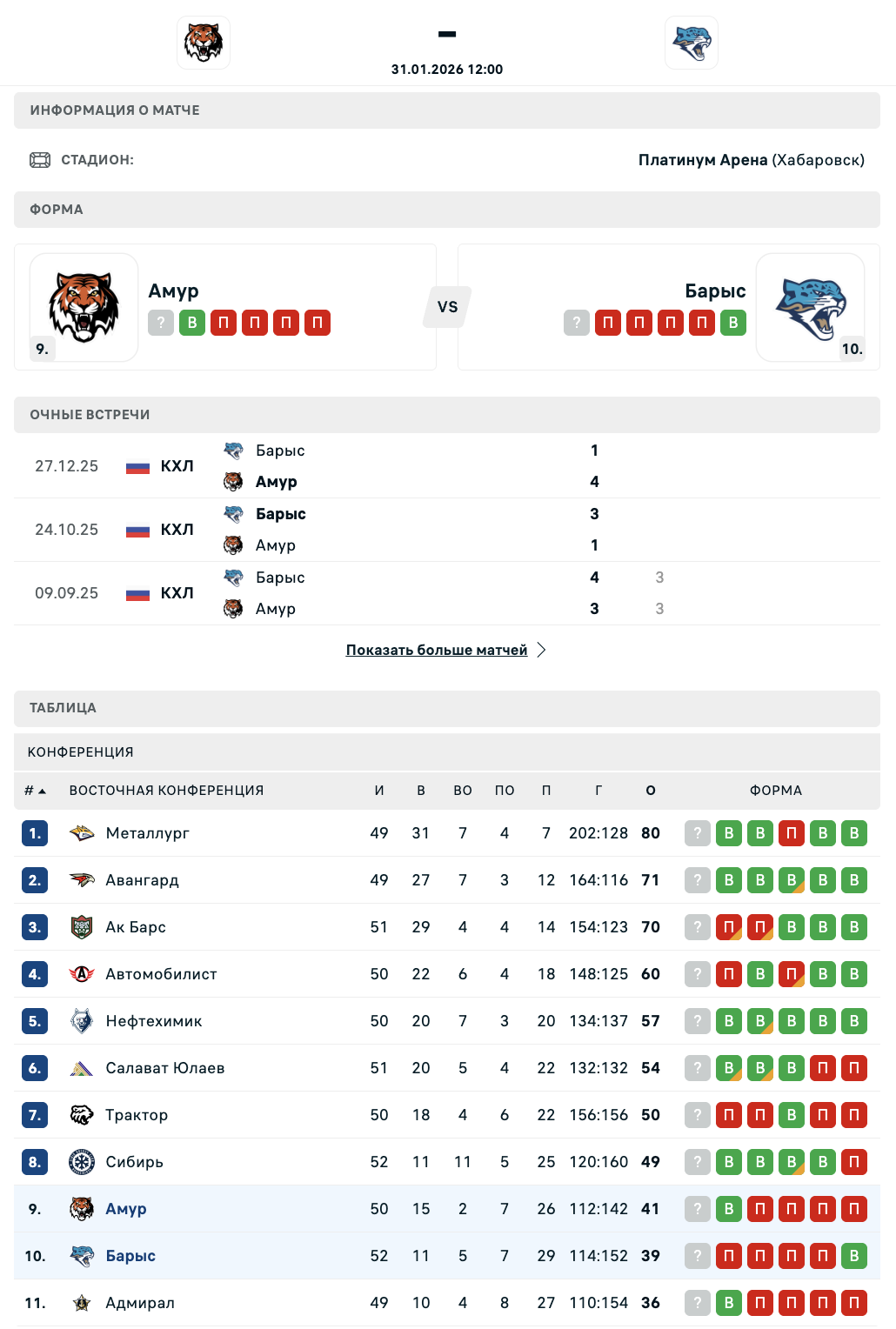 "Барыс" отправился в трёхматчевую поездку на Дальний Восток, в рамках которой проведёт две встречи подряд с "Амуром", а затем сыграет с "Адмиралом". Для астанчан этот отрезок сезона имеет важное турнирное значение на фоне неудачной серии.