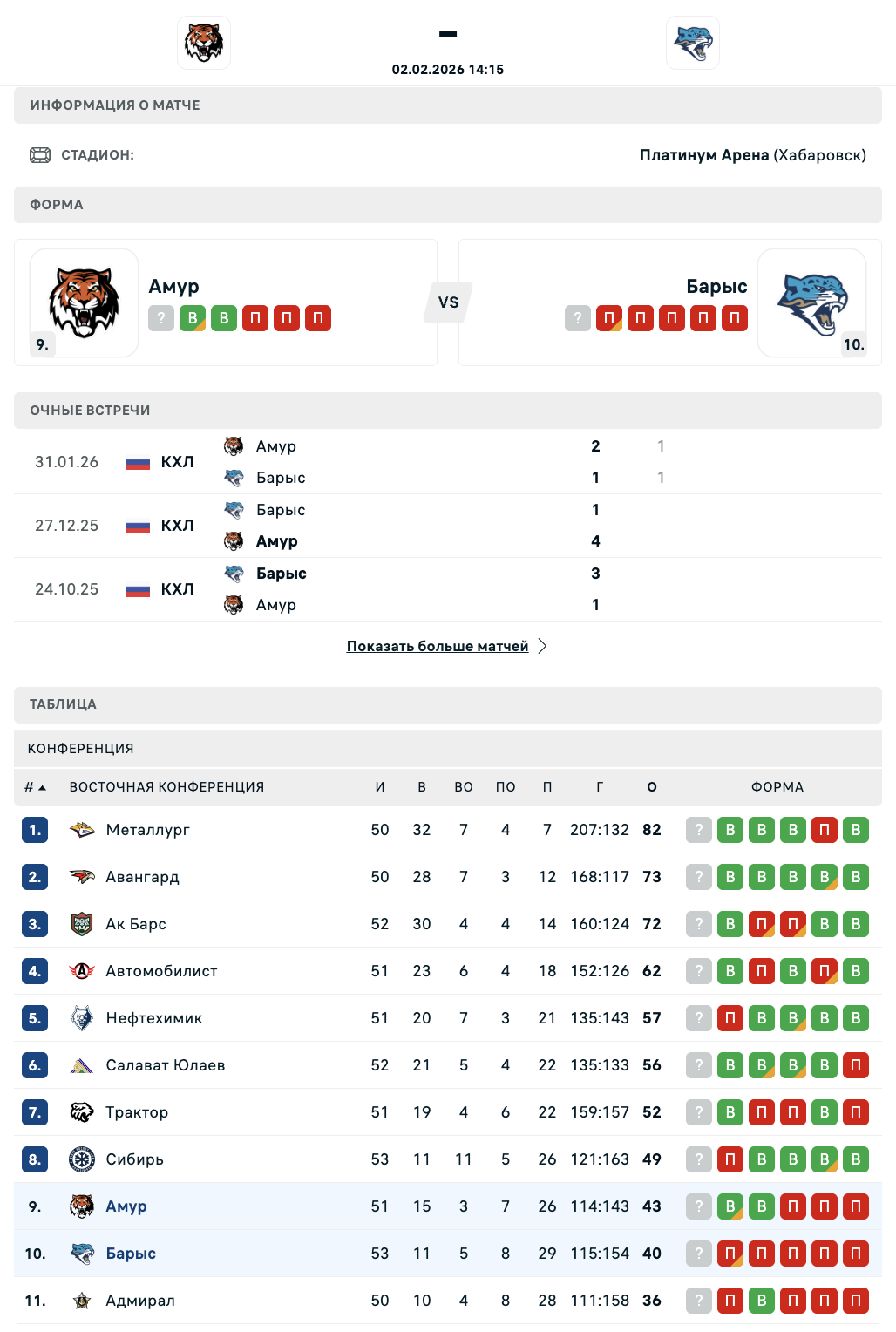 Хабаровский клуб идёт девятым, отставание от зоны плей-офф составляет шесть очков при двух матчах в запасе по сравнению с идущей восьмой "Сибирью".