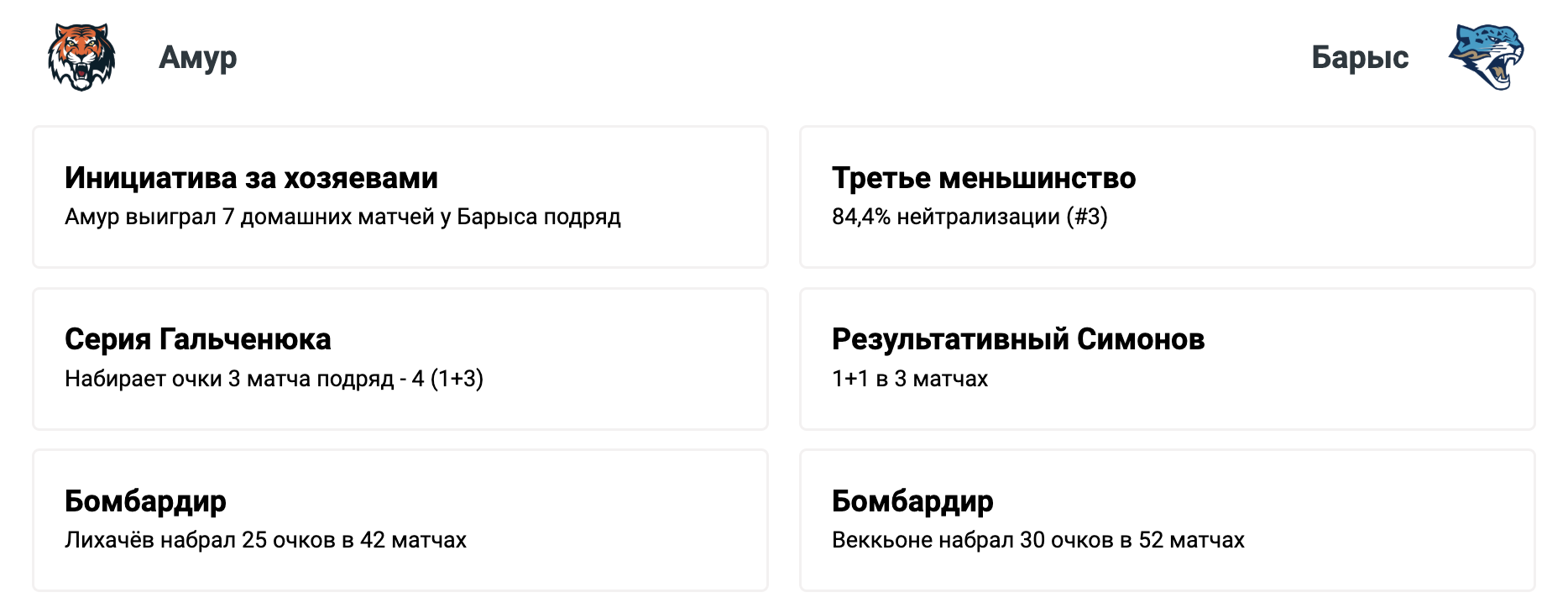 - Команды совершали менее 63 бросков в 10 вынесенных на понедельник/пятницу матчах подряд с участием "Амура" и в 16 матчах "Барыса" из последних 18.