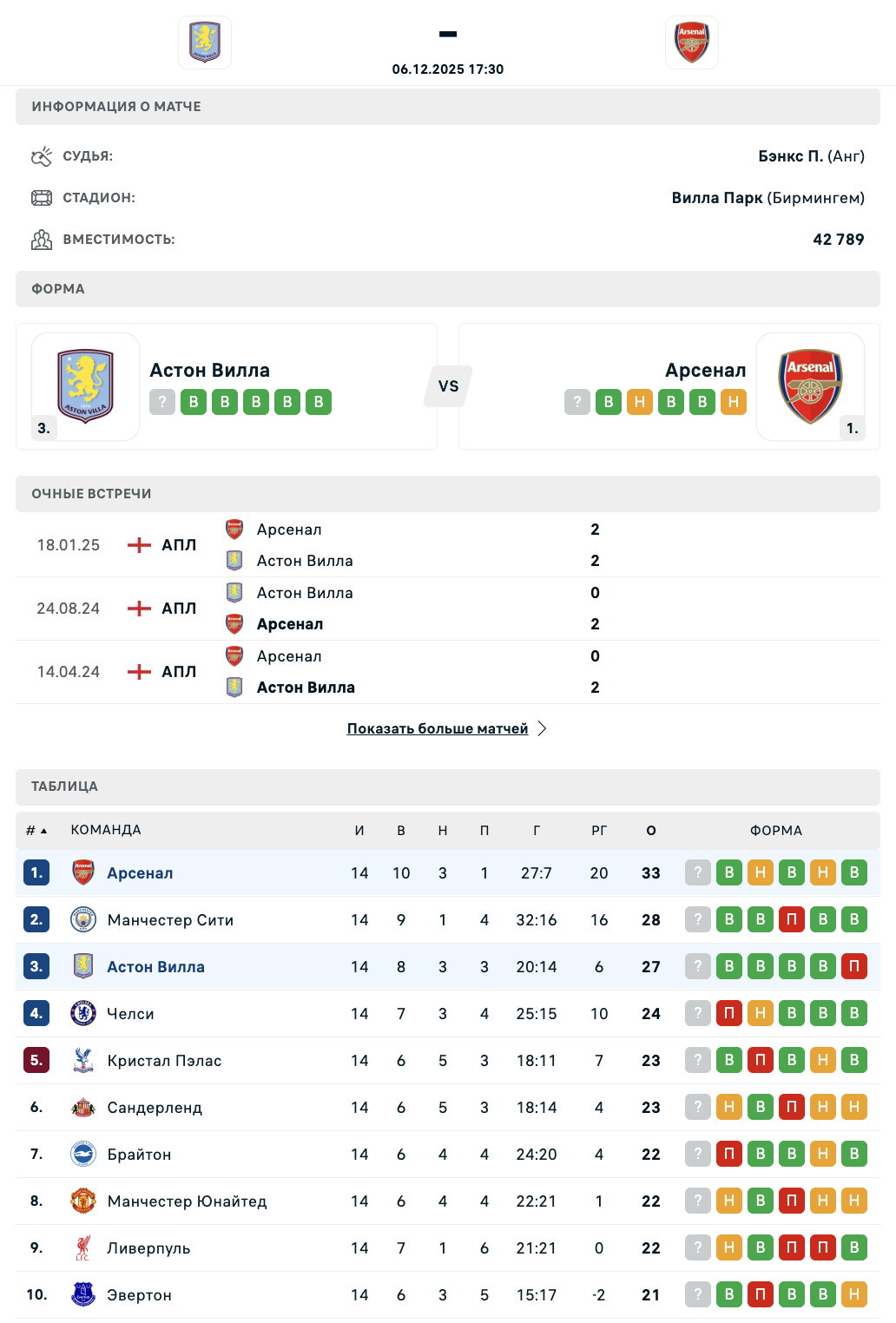 6 декабря состоится матч 15-го тура Премьер-лиги - "Астон Вилла" принимает "Арсенал".