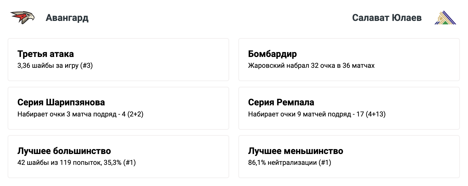 - Салават Юлаев не проигрывал с разницей в 2 и более шайбы в 17 матчах подряд в этом турнире.