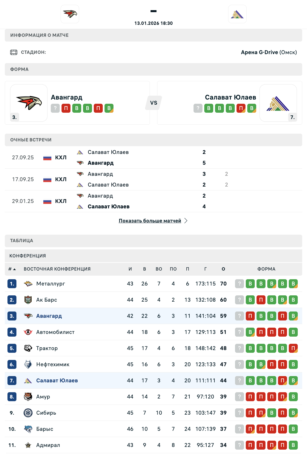 13 января в Омске состоится матч КХЛ - "Авангард" примет "Салават Юлаев". Начало - в 18:30 по времени Казахстана.