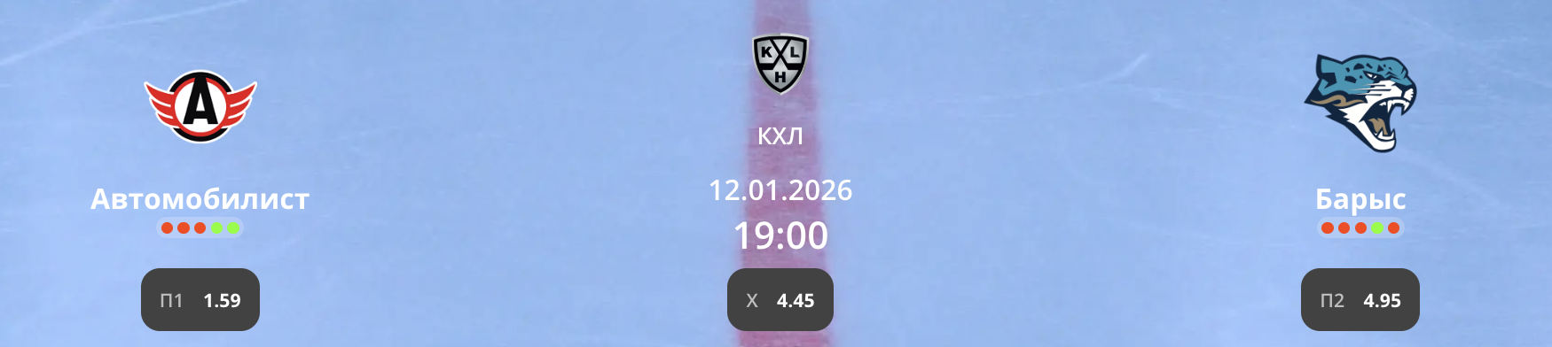 12 января состоится матч регулярного чемпионата КХЛ - "Автомобилист" примет "Барыс". Начало - в 19:00 по времени Казахстана.