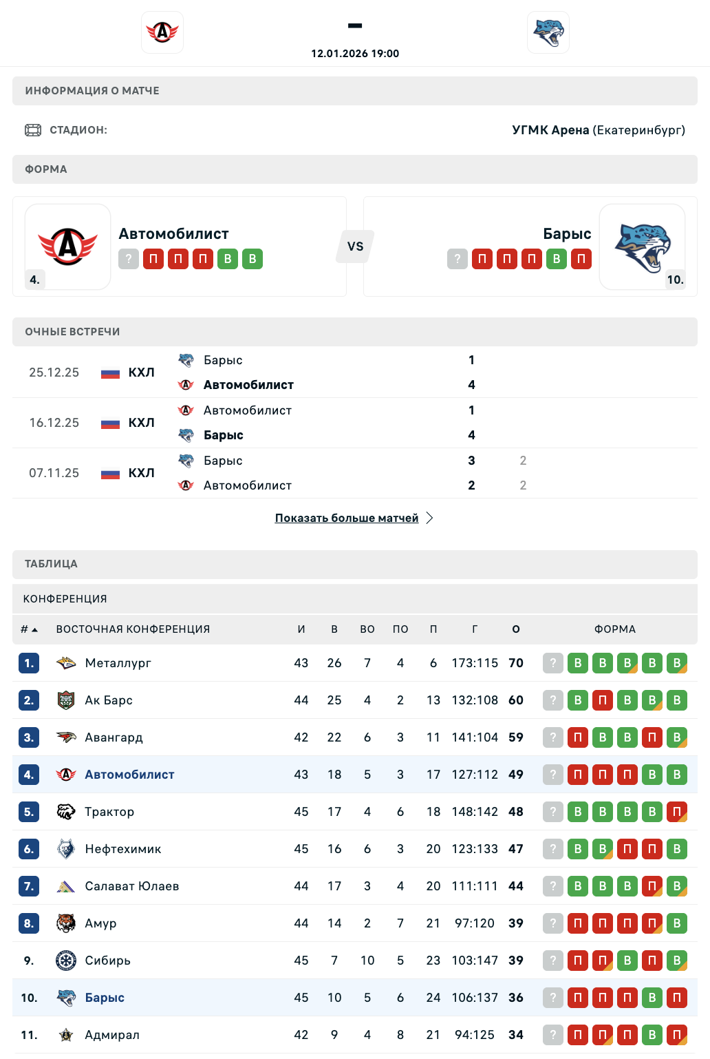 К новому противостоянию обе команды подходят, не одержав ни одной победы в 2026 году. "Автомобилист" под руководством Николая Заварухина потерпел три поражения подряд - от "Ак Барса" (0:5), "Трактора" (1:3) и "Салавата Юлаева" (1:4). "Барыс" в свою очередь уступил "Торпедо" (2:3), "Ак Барсу" (1:3) и "Салавату Юлаеву" (1:3).