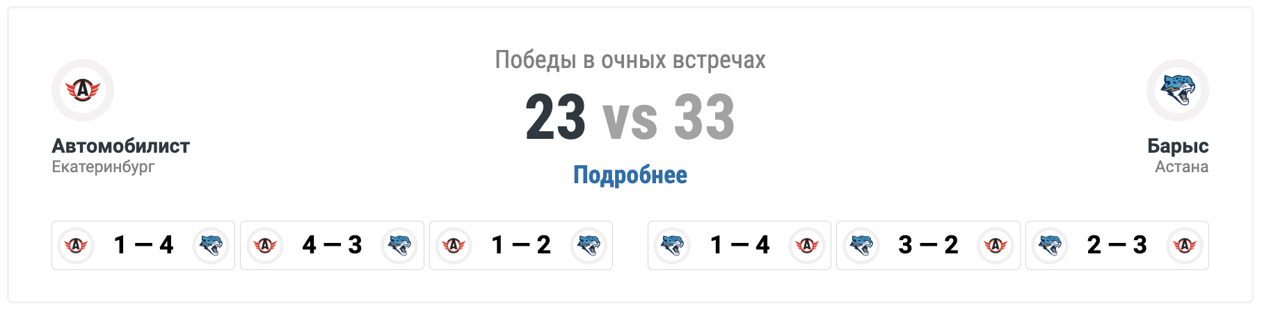 В истории КХЛ "Барыс" выиграл 33 из 56 очных встреч с "Автомобилистом".
