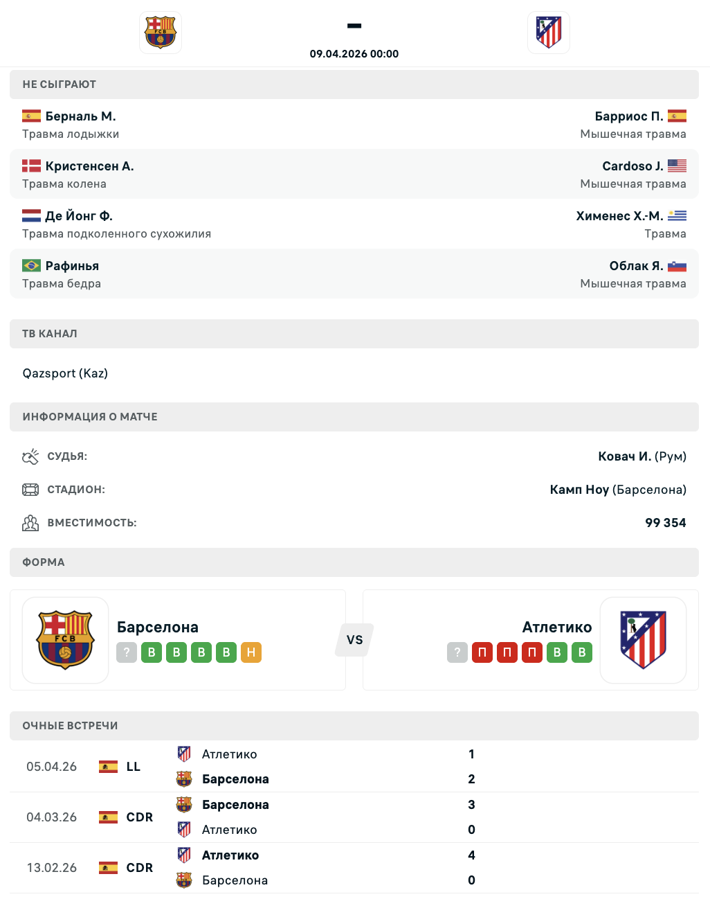 Гостевая форма "Атлетико" вызывает опасения: в четырёх из пяти последних выездных игр команда пропускала по три мяча. На фоне атакующей мощи "Барселоны" это может стать ключевым фактором.