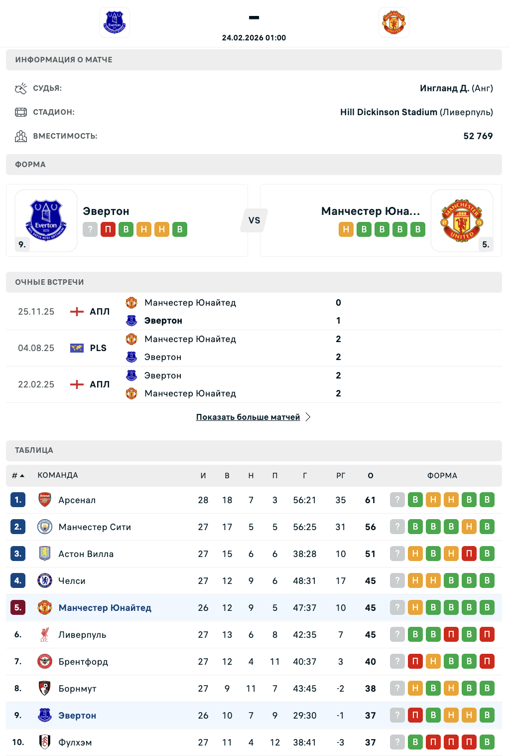 Ночью 24 февраля в Ливерпуле состоится матч 27-го тура английской Премьер-Лиги - "Эвертон" примет "Манчестер Юнайтед".