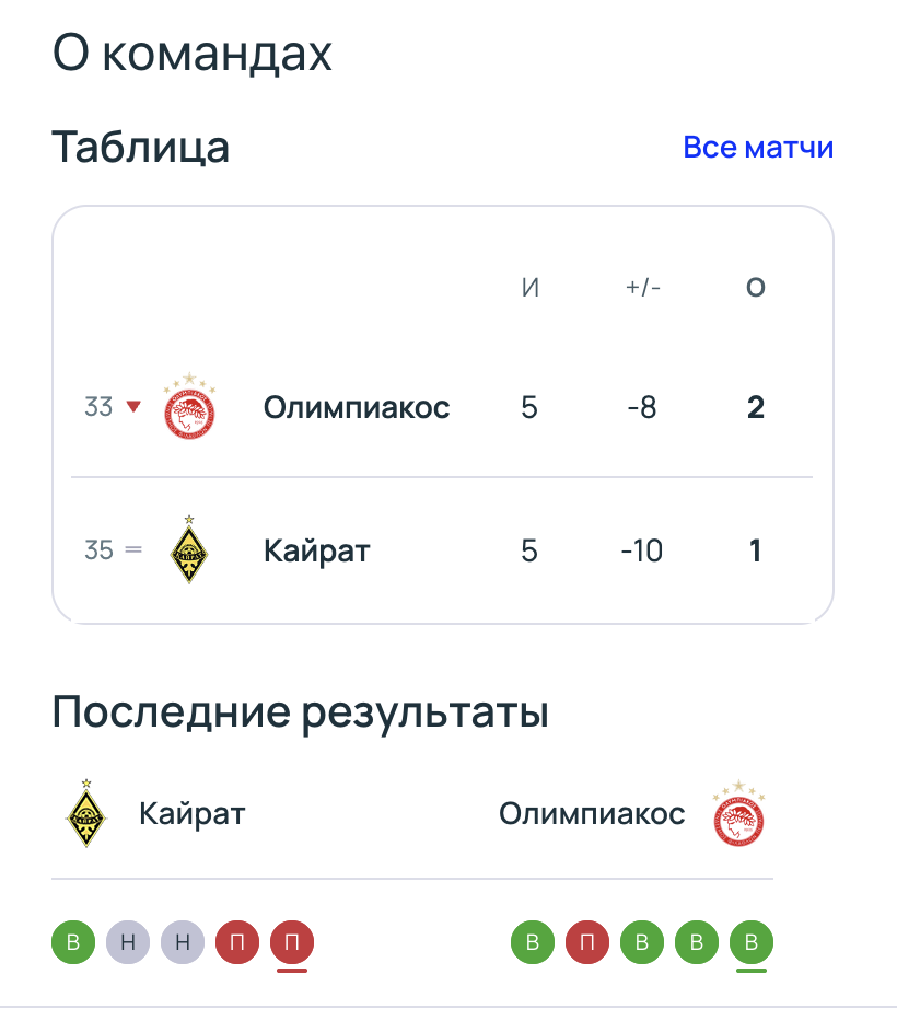 - "Олимпиакос" лишь однажды встречался с представителем Казахстана - на групповом этапе Лиги Европы УЕФА в сезоне 2016/17. Тогда пирейский клуб играл в одной группе с "Астаной", которую победил дома 4:1. Матч в Казахстане завершился со счетом 1:1.
