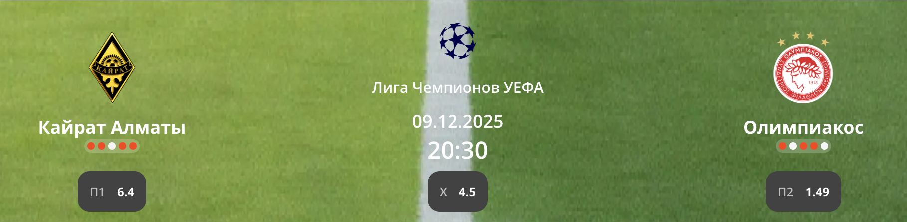 9 декабря состоится матч 6-го тура Лиги чемпионов УЕФА - "Кайрат" принимает "Олимпиакос". Начало - в 20:30 по времени Казахстана.