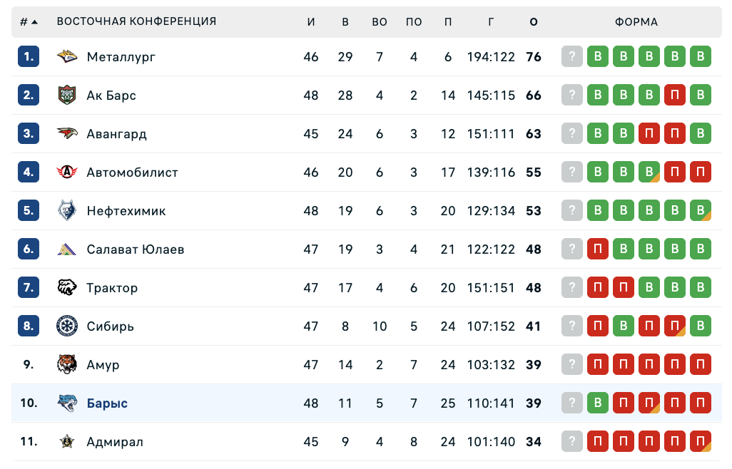 "Барыс" сохраняет шансы на борьбу за плей-офф на Востоке: после победы над ЦСКА (3:1) команда Михаила Кравца сократила отставание от идущей восьмой "Сибири" до двух баллов, правда, проведя на одну игру больше.
