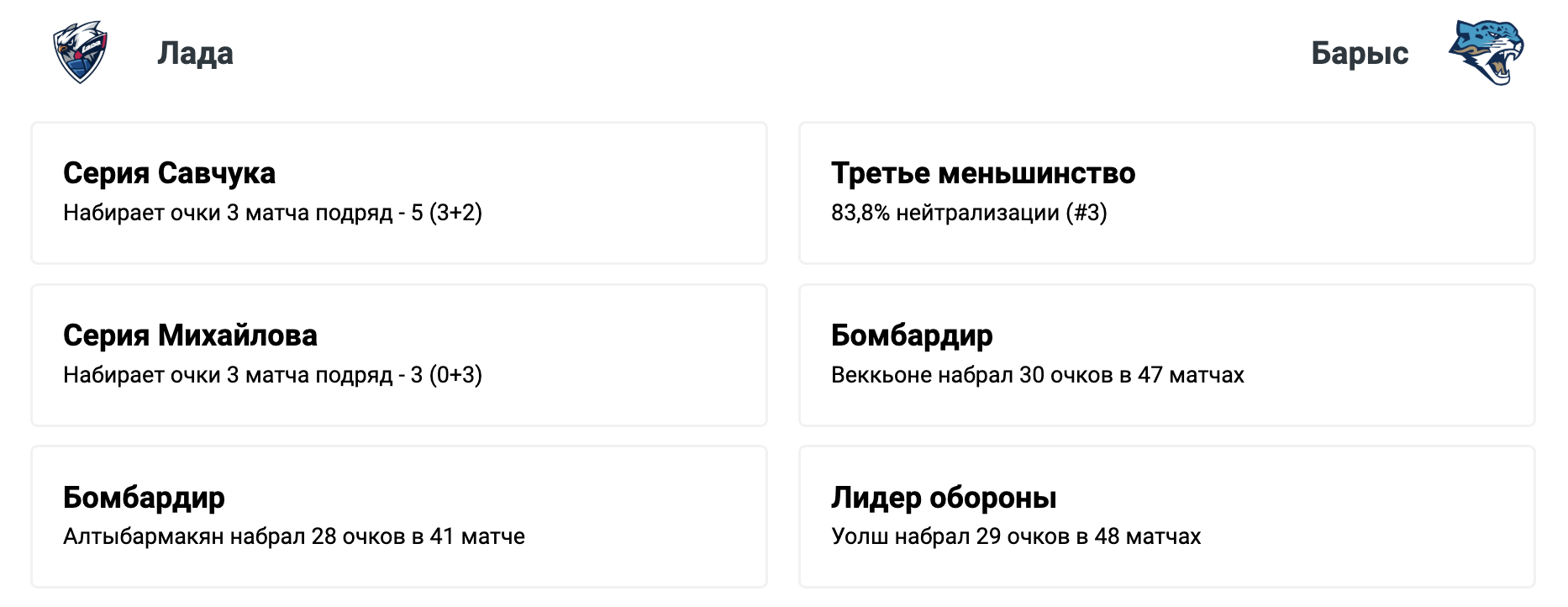 В составе "Лады" результативные серии из трёх матчей имеют Райли Савчук (3+2) и Никита Михайлов (0+3). Для Андрея Обидина следующий набранный балл станет 100-м в карьере в КХЛ. Защитник Владислав Сёмин входит в топ-5 сезона по силовым приёмам - 133 в 45 матчах.