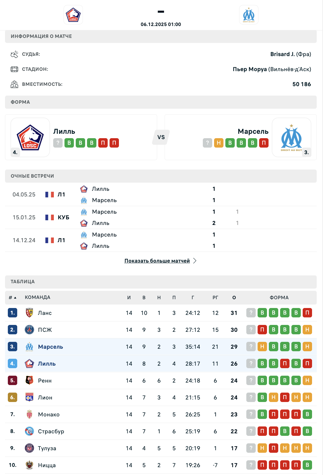 6 декабря состоится матч 15-го тура Лиги 1 - "Лилль" принимает "Олимпик Марсель".
