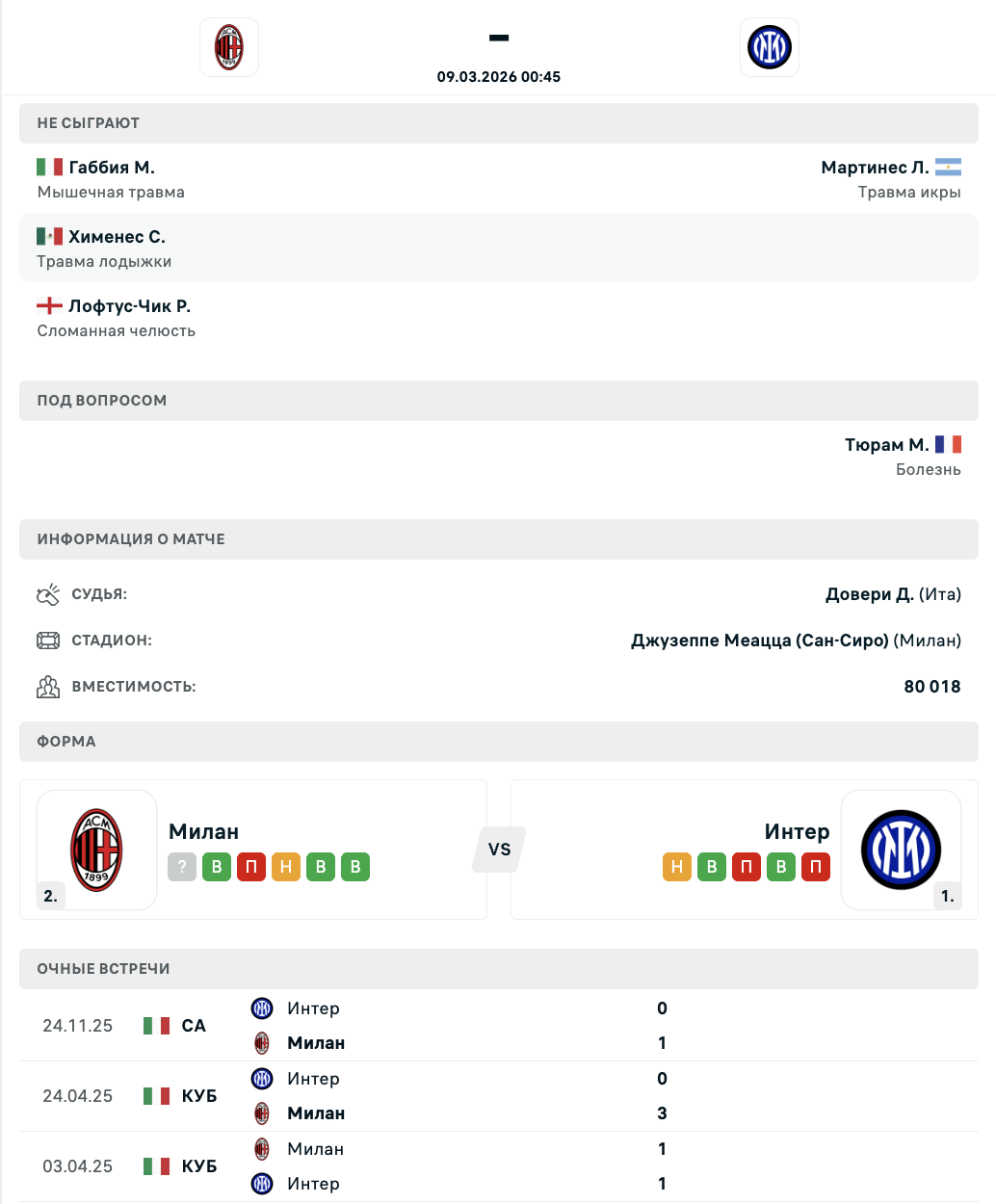 Милан - Интер: варианты от аналитиков на матч Серии А