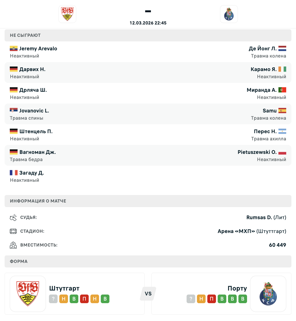 Немецкий клуб подходит к игре не в лучшей серии - у команды всего одна победа в четырёх последних матчах. При этом "швабы" продолжают успешно выступать на нескольких фронтах: они добрались до полуфинала Кубка Германии и удерживаются в группе лидеров Бундеслиги, потерпев лишь одно поражение за последние 12 туров.