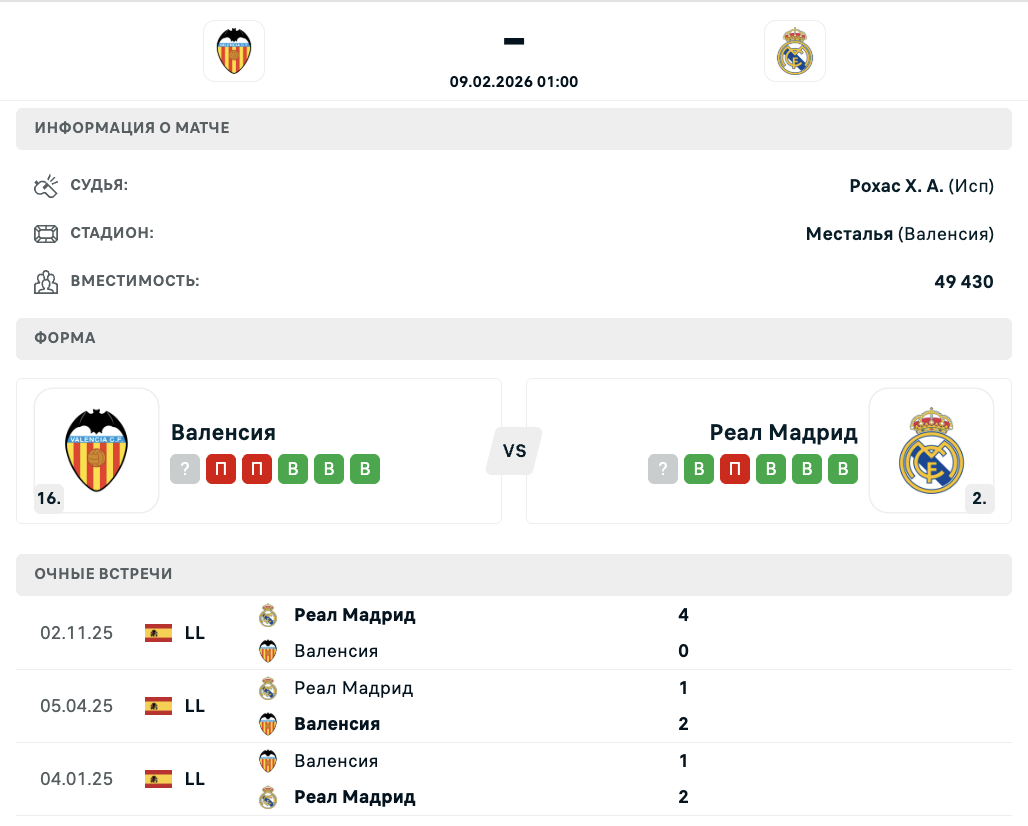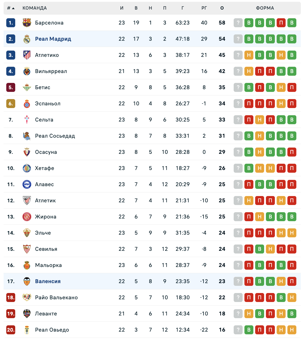 "Валенсия" идёт 16-й в таблице Ла Лиги и опережает зону вылета всего на одно очко. "Реал" занимает второе место и отстаёт от "Барселоны" на один балл.